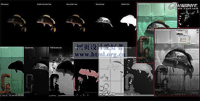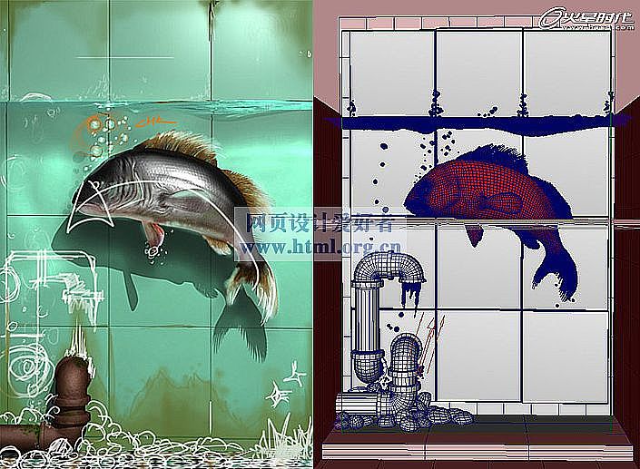 參考概念化之后,我真的需要很多有關(guān)水,氣泡,礫石,泥土磚的參考,尤其是魚(yú)的參考。我從網(wǎng)絡(luò)和自己的素材庫(kù)里收集所有可能有用的參考。要在一幅藝術(shù)作品中創(chuàng)造一個(gè)重要的角色,首先要了解它的解剖結(jié)構(gòu)。為了更好的建模和制作紋理,我研究了魚(yú)的解剖結(jié)構(gòu)。(圖04)