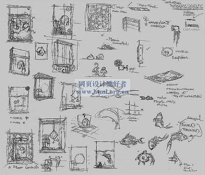 粗略計(jì)算后,我開(kāi)始畫(huà)概念圖,認(rèn)為要添加更多的元素在里面。我剛開(kāi)始想著在同一時(shí)間增加兩條以上的魚(yú),但它讓場(chǎng)景變的復(fù)雜和不平衡。我想花多一點(diǎn)的時(shí)間在概念設(shè)定上,使它盡可能的清晰明了。概念圖使我對(duì)構(gòu)圖和POV有一個(gè)直觀的了解。(圖03)