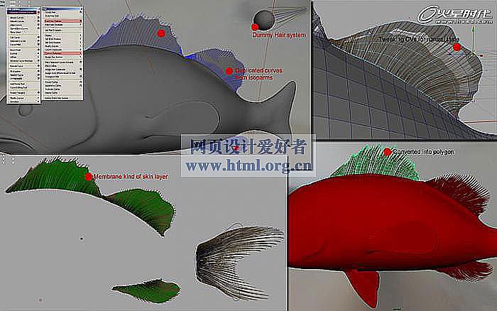 對(duì)于上鰭、下鰭和尾鰭,我用NURBS和毛發(fā)系統(tǒng)。這個(gè)過(guò)程很簡(jiǎn)單,但它讓我在正確的位置生成了正確的鰭。我按住Shift鍵并選擇全部的Isoparms,然后我復(fù)制曲線轉(zhuǎn)變?yōu)轭^發(fā)。為了更優(yōu)化我再次把頭發(fā)轉(zhuǎn)變?yōu)槎噙呅危缓笤賈B中把魚(yú)雕刻出更多Cool的造型。(圖12)
