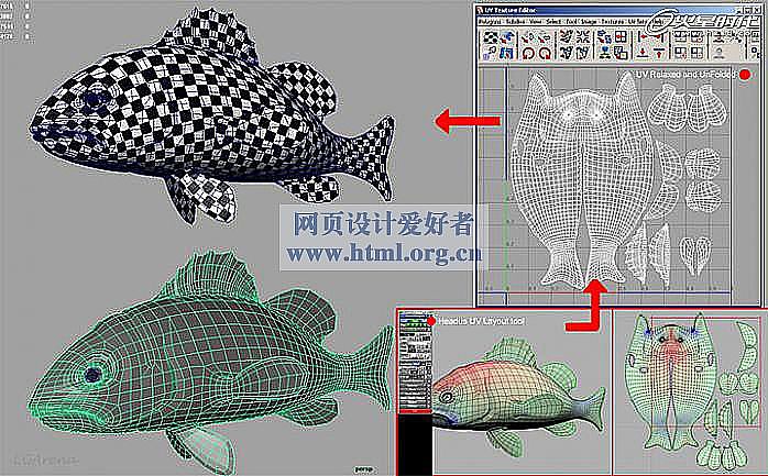 為了在ZB中得到更好的結(jié)果,我按照實(shí)際中需要的對(duì)魚(yú)進(jìn)行了重新拓?fù)洹.?dāng)一個(gè)帶有凹凸、法線、置換貼圖的角色要進(jìn)行動(dòng)畫(huà)時(shí),布線結(jié)構(gòu)是非常重要的。在開(kāi)始雕刻之前,我用UV-layout把魚(yú)的UV分了一下。(圖11)