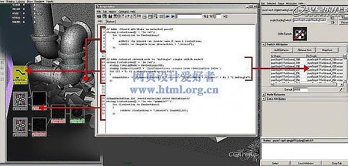 所以我給了礫石基本的Single switch節(jié)點(diǎn),還使用了3個(gè)小的腳本。 用腳本指定用戶定義的屬性Vcoord給選擇的對(duì)象。用腳本來(lái)連接幾何與選定在Hypershade中單個(gè)開(kāi)關(guān)節(jié)點(diǎn)。用腳本隨機(jī)所有選取的幾何屬性為Vcoord。(圖17)