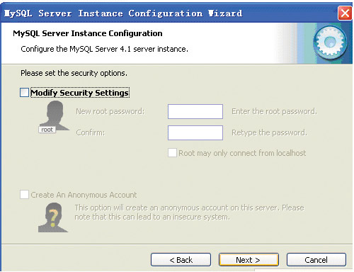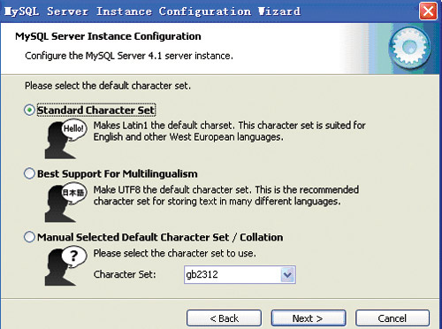 在圖2所示窗口的“character set”的下拉列表中選擇“gb2312”,按“next”按鈕。在接下來的配置mysql服務器過程中,出現如圖3所示窗口。