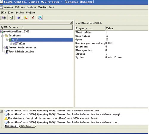 安裝完成后,點擊“開始”→“程序”→“mysql control center”→“mysql control center”,出現如圖4所示窗口。通過圖4所示的這個窗口就可以對mysql數據庫進行可視化操作了。