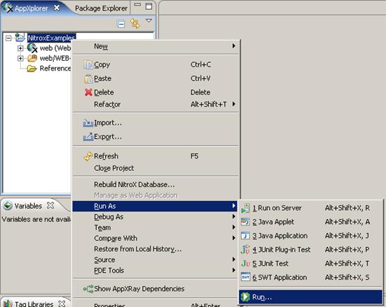 在appxplore視圖的nitroxexamples節點單擊右鍵,在彈出的上下文菜單中選擇run asàrun…。