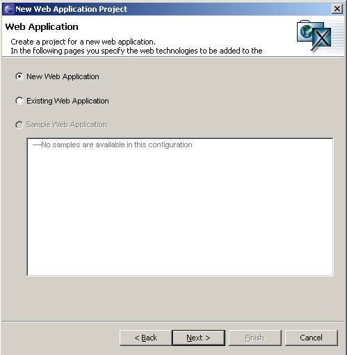 點擊next按鈕進入web應用的配置界面,在這里你可以選擇新建web應用或者是從已有的web應用開始創建,為了演示的簡單,這里選擇新建web應用。