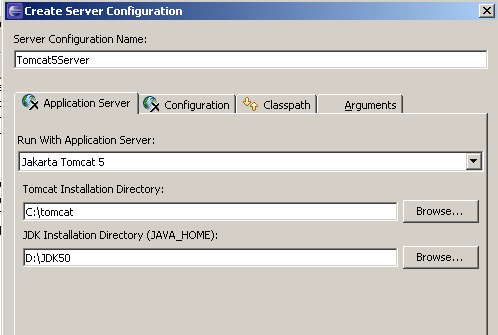 單擊run with server域后面的new…按鈕,進入servlet容器的配置界面。在server configuration name文本域中輸入tomcat5server,在run with application server域中選擇jakarta tomcat5,單擊tomcat installation directory域后面的browse…按鈕后選擇tomcat的安裝目錄,單擊jdk installation directory域后面的browse…按鈕后選擇jdk的安裝目錄。