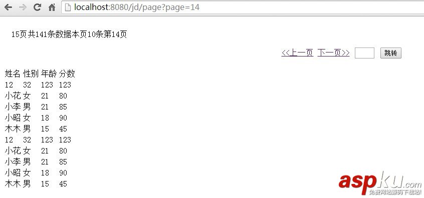 分頁效果如下:能通過點擊上頁下頁實現翻頁,輸入指定頁面跳轉(超出范圍跳轉到第1或最后頁)。具體實現請參見詳細代碼,我都貼上來了。小菜鳥一名,處于正在學習階段,有大神能指點下當然更好,希望不吝賜教!