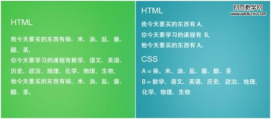 有沒有發現如果一旦形容的事情過多,想要把事情描述清楚的時候,我們不得不重復大量的信息?頁面語言也是一樣,在這種情況下顯得雜亂無章,非常難以理出頭緒。通過將控制顯示效果的語言集成到CSS里,我們不但可以保證頁面語言主體部分的簡潔,而且可以非常方便的復用各種語言集合。