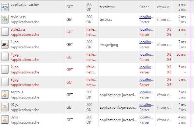 CACHE MANIFESTCACHE:# 需要緩存的列表style1.css1.jpg01.jshttp://localhost/applicationcache/02.jshttp://localhost/applicationcache/zepto.jsNETWORK:# 不需要緩存的4.jpgFALLBACK:# 訪問緩存失敗后,備用訪問的資源,第一個是訪問源,第二個是替換文件*.html /offline.html2.jpg/3.jpg