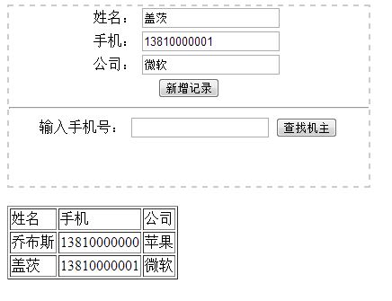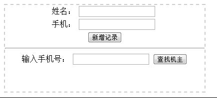 <!DOCTYPE HTML> <html> <head> <meta charset="utf-8"/> <title>HTML5本地存儲之Web Storage篇</title> </head> <body> <div style="border: 2px dashed #ccc;width:320px;text-align:center;"> <label for="user_name">姓名:</label> <input type="text" id="user_name" name="user_name" class="text"/> <br/> <label for="mobilephone">手機:</label> <input type="text" id="mobilephone" name="mobilephone"/> <br/> <input type="button" onclick="save()" value="新增記錄"/> <hr/> <label for="search_phone">輸入手機號:</label> <input type="text" id="search_phone" name="search_phone"/> <input type="button" onclick="find()" value="查找機主"/> <p id="find_result"><br/></p> </div> <br/> <div id="list"> </div> </body> </html>