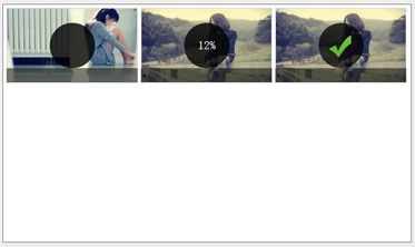 <!DOCTYPE html> <html> <head> <title></title> <meta charset="utf-8"/> <link href="reset.css" type="text/css" rel="stylesheet"/> <link href="01.css" type="text/css" rel="stylesheet"/> </head> <body> <div id="uploadBox"> <ul> <li> <img src="images/pic1.jpg"/> <span class="progress"></span> <span class="percentage"></span> </li> <li> <img src="images/pic2.jpg"/> <span class="progress"></span> <span class="percentage">12%</span> </li> <li class="done"> <img src="images/pic2.jpg"/> <span class="progress"></span> <span class="percentage"></span> </li> <div class="clearfix"></div> </ul> </div> </body> </html>