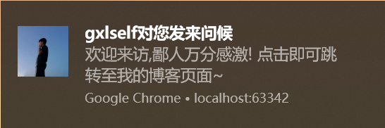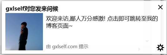 // index.jswindow.onload = function(){ let gxlself = new Gxlself() gxlself.requestPermission() setTimeout(()=>{ gxlself.showNotification() },3000)}class Gxlself{ constructor(){ this.isNotificationSupported = "Notification" in window; } isPermissionGranted(){ return Notification.permission === 'granted'; } requestPermission(){ if(!this.isNotificationSupported){ return; } Notification.requestPermission(status=>{ let permission = Notification.permission; }) } showNotification(){ if (!this.isNotificationSupported) { return; } if (!this.isPermissionGranted()) { return; } var n = new Notification("gxlself對您發來問候", { icon : 'gxlself.png', body : '歡迎來訪,鄙人萬分感激! 點擊即可跳轉至我的博客頁面~' }); n.onshow = function () { console.log('gxlself已經發送通知信息'); setTimeout(function() { n.close(); }, 5000); } n.onclick = function () { location. n.close() } n.onerror = function (err) { console.log(err) } n.onclose = function () { console.log('gxlself消息窗口關閉') } } }這是火狐瀏覽器執行后的效果展示: