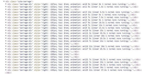//彈幕var winWidth = $(window).width(); //獲取屏幕寬度$(".barrage-div").each(function(index,value){ //遍歷每條彈幕 var width = $(value).width(); //獲取當前彈幕的寬度 var topRandom = Math.floor(Math.random() * 3) + 'rem'; //獲取0,1,2的隨機數 可根據情況改變 $(value).css({"right":-width,"top":topRandom}); //將彈幕移動到屏幕外面,正好超出的位置 //拼寫動畫幀函數,記得每個ani要進行區分,寬度從自己的負寬度移動一整個屏幕的距離 var keyframes = `/ @keyframes ani${index}{ form{ right:${-width}px; } to{ right:${winWidth}px; } }/ @-webkit-keyframes ani${index}{ form{ right:${-width}px; } to{ right:${winWidth}px; } }`; //添加到頁面的head標簽里面 $("<style>").attr("type","text/css").html(keyframes).appendTo($("head")); //定義動畫速度列表 var aniList = [3,5,7,9,11]; //取數組的隨機數,0,1,2,3,4 var aniTime =Math.floor(Math.random() * 5); //給當全前彈幕添加animation的css //延遲的時間用每個的*1.5倍,這個可變 $(value).css({"animation":`ani${index} ${aniList[aniTime]}s linear ${index * 1.5}s`,"-webkit-animation":`ani${index} ${aniList[aniTime]}s linear ${index * 1.5}s`});})之后看看瀏覽器的效果: