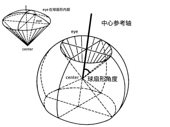 g3d.addPropertyChangeListener(e => { // 固定中心點 if (e.property === 'center') { e.newValue[0] = center[0]; e.newValue[1] = center[1]; e.newValue[2] = center[2]; }}然后再把 eye 限制在某一個范圍內就大功告成了,然而這里卻并不是那么簡單,最開始我把 eye 限制在一個立方體的空間內,但交互效果很不理想,考慮到 g3d 默認交互中,鼠標拖拽平移視角變換時,實際上 eye 是在一個以 center 為球心的球面上運動的,所以我決定從這個球中挖出來一塊作為 eye 的限制空間,也就是球扇形,不太理解的朋友可以參考這個圖: