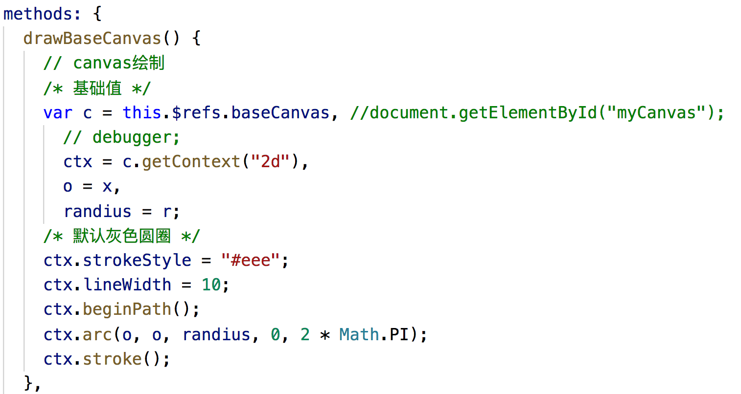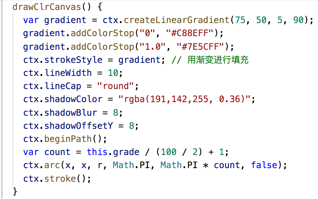 drawBaseCanvas:用來繪制底部灰色圓環。由于灰色圓環沒有動畫效果,所以一開始就繪制一個完整的灰色圓環即可。drawClrCanvas:用來繪制上邊的彩色圓環。clearCanvas:用來清空畫布。這是彩色圓環動畫需要。因為我們圓環動畫效果的核心就是,每隔一段時間就把彩色圓環清空一下,然后把結束角度值增大、重畫,這樣連續起來就是動畫。