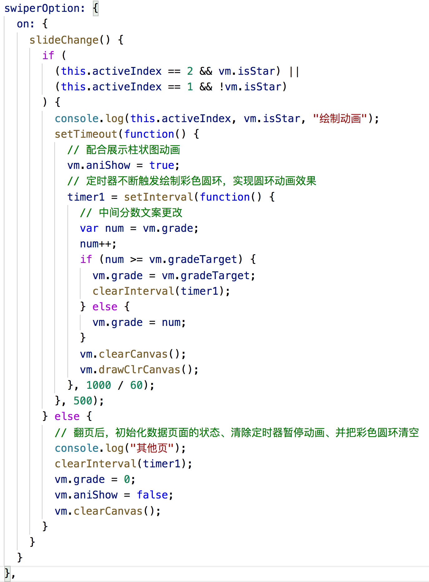 總而言之,當滿足條件、用戶翻到canvas所在swiper頁面后,我就要觸發if里邊的圓環繪制邏輯。否則就走到else里初始化數據頁面的狀態、清除定時器暫停動畫、并把彩色圓環清空