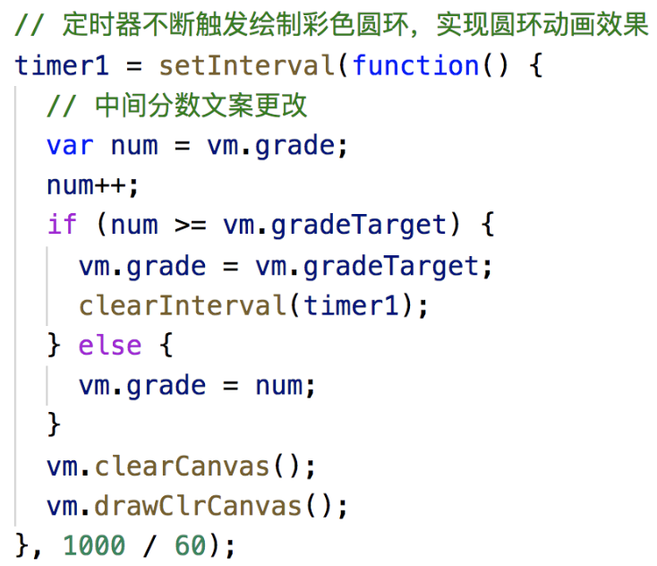 其實沒必要在定時器里重新調用彩色圓環繪制方法。我們直接改的是this.grade屬性,監聽這個屬性的改變就好了其實。這樣此屬性在定時器中被修改,圓環方法就會自動執行。