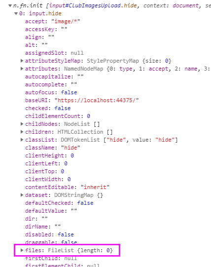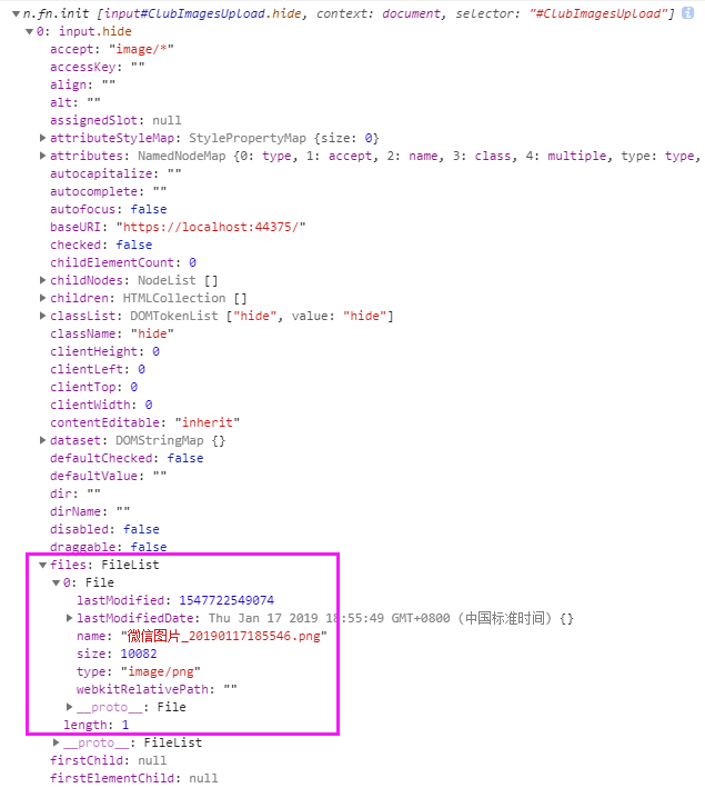$("#btnClubImg").click(function() { var $input = $("#ClubImagesUpload"); console.log($input); $input.on("change", function () { console.log(this);//打印改變后的當前元素 });}); 讓我們來瞄一眼,獲取到改變后的input元素里面有些啥東東: