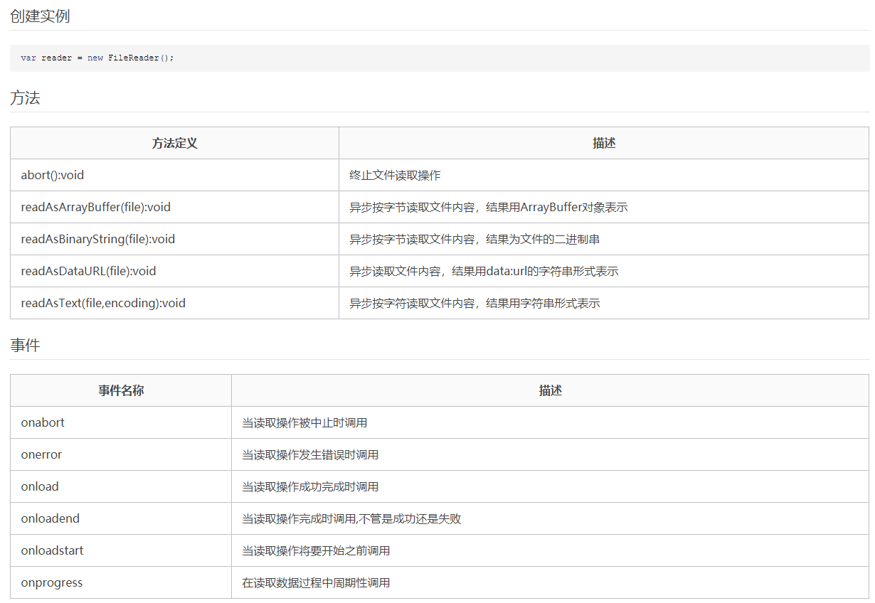 var fileReader = new FileReader();//實例化一個FileReader對象var file_ = files[key];//獲取當前文件if (/^image///w+$/.test(file_.type)) {//將當前文件進行正則匹配,看是否是選擇的圖片 fileReader.onload = function() {//當讀取操作完成時調用 } } 有必要延伸下FileReader的知識點: