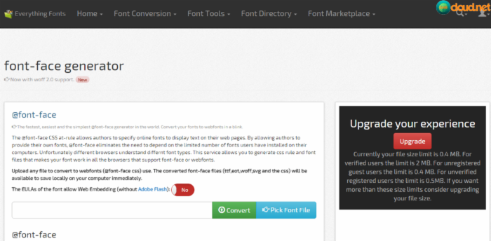 這個生成器可以讓你上傳網頁上的字體或是系統里面的字體。然后生成一個可以拿來用的輸出文件。這個生成器給字體屬性生成了一個CSS文件,然后字體就可以顯示在HTML文件里了。這是一個非常好的檢查字體工具,尤其是你沒有足夠的時間去創建一個使用許多重復性字體的完整的網站時候。