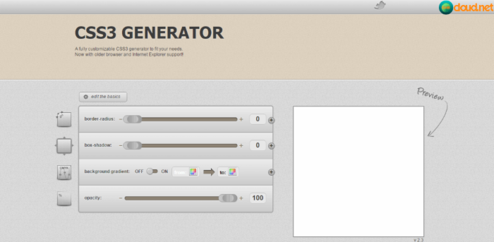 個人而言,我是很喜歡這個生成器, CSS3.me是由設計師Eric Hoffman設計出來的。它使用起來很簡便,是一個輕量級的、個性化而又功能強大的生成器。你可以用它來設置透明度、下拉陰影,改變和設置圓角邊框,增加漸變效果等等。