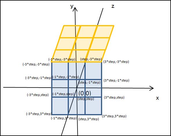 魔方分為6個面,先看一下最前面的一面,如果以立方體的中心作為3D坐標系的中心,那么9個小矩形的各個定點所對應的坐標如下圖所示