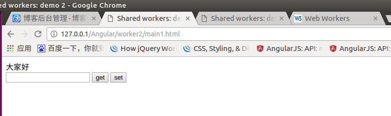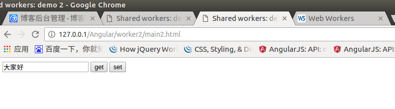 //main1 和main2都是這樣<!DOCTYPE HTML><html><head> <title>Shared workers: demo 2</title></head><body><div id="log"></div><input type="text" name="" id="txt"><button id="get">get</button><button id="set">set</button><script> var worker = new SharedWorker('shared.js'); var get = document.getElementById('get'); var set = document.getElementById('set'); var txt = document.getElementById('txt'); var log = document.getElementById('log'); worker.port.addEventListener('message', function(e) { log.innerText = e.data; }, false); worker.port.start(); // note: need this when using addEventListener set.addEventListener('click',function(e){ worker.port.postMessage(txt.value); },false); get.addEventListener('click',function(e){ worker.port.postMessage('get'); },false);</script></body></html>//sharedvar data;onconnect = function(e) { var port = e.ports[0]; port.onmessage = function(e) { if(e.data=='get'){ port.postMessage(data); }else{ data=e.data; } }}這里分析一波,我們在main1.html的文本框輸入數(shù)據(jù),點擊set,然后在main2.html中點擊get法現(xiàn)能夠獲取到我們在main1.html中設置的數(shù)據(jù),這說明我們的sharedWorker事實上是單例的,就像java中的static類一樣,不管new多少個,實際上只有一個,這樣我們的不同線程就可以共享到sharedWorker中的數(shù)據(jù)了。這里把圖給上,記得有篇文章沒給圖,然后有人給我建議了,問能不能給圖。