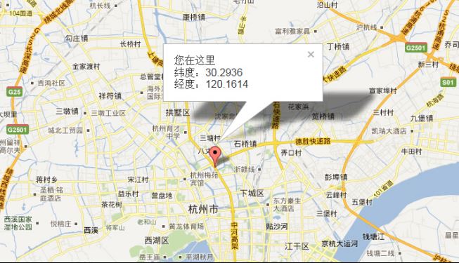 locationError: function(error){ switch(error.code) { case error.TIMEOUT: showError("A timeout occured! Please try again!"); break; case error.POSITION_UNAVAILABLE: showError('We can/'t detect your location. Sorry!'); break; case error.PERMISSION_DENIED: showError('Please allow geolocation access for this to work.'); break; case error.UNKNOWN_ERROR: showError('An unknown error occured!'); break; }}locationSuccess為獲取位置信息成功的回調函數,返回的數據中包含經緯度等信息,結合Google Map API 即可在地圖中顯示當前用戶的位置信息,如下: