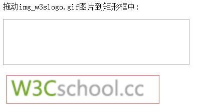 <!DOCTYPE html><html><head><title>HTML5拖拽</title><meta charset="utf-8"><style>#div1 {width:350px;height:70px;padding:10px;border:1px solid #aaaaaa;}</style></head><body><p>拖動img_w3slogo.gif圖片到矩形框中:</p><div id="div1" ondrop="drop(event)" ondragover="allowDrop(event)"></div><br><img id="drag1" src="images/img_w3slogo.gif" draggable="true" ondragstart="drag(event)" width="300" height="56"><script>function allowDrop(ev){ ev.preventDefault();}function drag(ev){ ev.dataTransfer.setData("Text",ev.target.id);}function drop(ev){ ev.preventDefault(); var data=ev.dataTransfer.getData("Text"); ev.target.appendChild(document.getElementById(data));}</script></body></html>拖拽前的頁面效果為: