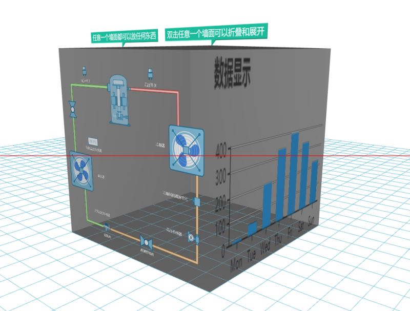 ht.Default.xhrLoad('displays/demo/pump.json', function(text){    const json = ht.Default.parse(text);    pumpDM.deserialize(json);    var currentRotation = 0;    var lastTime = new Date().getTime();    setInterval(function(){        var time = new Date().getTime();        var deltaTime = time - lastTime;        currentRotation += deltaTime * Math.PI / 180 * 0.3;        lastTime = time;        pumpDM.getDataByTag('fan1').setRotation(currentRotation);        pumpDM.getDataByTag('fan2').setRotation(currentRotation);        box.iv();        // g3d.iv();這邊也可以刷新g3d,但是局部刷新更省        pumpGV.validateImpl();    }, 10);}, 10);這個時候我不能把pumpGV和g3d都加到底層div上,并且我的意圖是把pumpGV加到g3d中的CSGBox中的一面上,所以為了讓pumpGV顯示出來 必須設(shè)置pumpGV的寬高,而這個寬高必須比我json畫出來的圖占的面積要大,不然顯示不完整。如果想看這個寬高對顯示的影響,可以自己改改看來玩玩。
