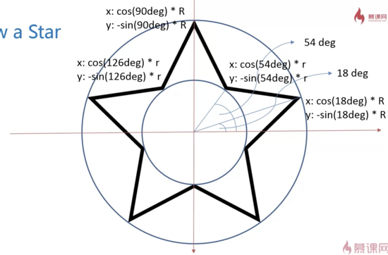 角度轉弧度——弧度=角度*π/180 即(18+i*72)*Math.PI/180