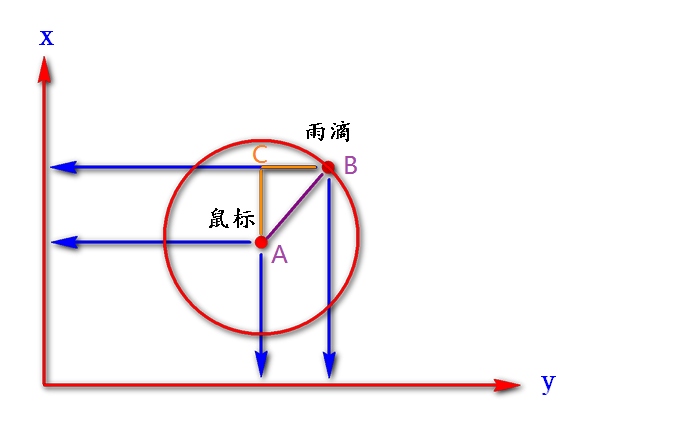 我們知道雨滴到鼠標的直線距離后,和圓的半徑比較下,大于半徑就不在范圍內,否則就是在了。