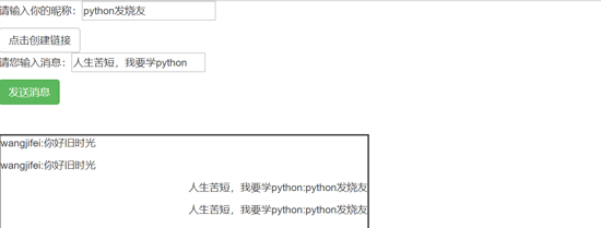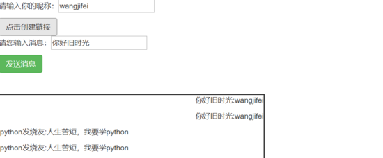 <!DOCTYPE html><html lang="en"><head> <meta charset="UTF-8"> <title>Title</title> <link href="https://cdnjs.cloudflare.com/ajax/libs/twitter-bootstrap/3.3.7/css/bootstrap.css" rel="stylesheet"></head><body><p>請輸入你的昵稱:<input type="text" id="username"></p><botton class="btn btn-default" onclick="createsocket()">點(diǎn)擊創(chuàng)建鏈接</botton><br><p>請您輸入消息:<input type="text" id="msg"></p><buttom class="btn btn-success" onclick="send_msg()">發(fā)送消息</buttom><br><br><br><div style="border: 2px solid; width: 500px;height: 800px;" id="text_div"></div><script> var ws = null; var username = null; function createsocket() { username = document.getElementById("username").value; ws = new WebSocket("ws://127.0.0.1:8001/ws" + "/" + username); ws.onmessage = function (data) { var text_div = document.getElementById("text_div"); var obj_data = JSON.parse(data.data); var add_msg = "<p>" + obj_data.sender + ":" + obj_data.msg + "</p>"; text_div.innerHTML += add_msg; } } function send_msg() { var to_msg = document.getElementById("msg").value; var text_div = document.getElementById("text_div"); var add_msg = "<p style='text-align: right'>" + to_msg + ":" + username + "</p>"; text_div.innerHTML += add_msg; ws.send(to_msg); }</script></body></html>