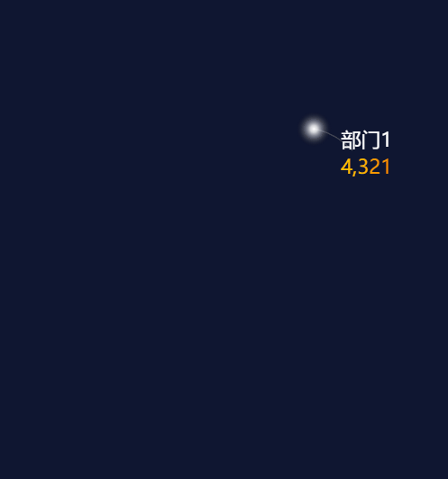 /** * 創建文本 * @param {String} 部門數據 * @param {Number} 數據 * @param {Number} x軸坐標 * @param {Number} y軸坐標 */function drawText(department, value, x, y) { ctx.fillStyle = '#fff' ctx.font = "22px 微軟雅黑"; ctx.fillText(department, x + 30, y + 20); //為了使文本在光暈右下角x,y軸需要偏移一些距離 var width = ctx.measureText(value).width; //獲取文本的寬度 ctx.fillStyle = createLinearGradient([x + 30, 0], //文本漸變x軸的渲染范圍是[x+30,x+30+文本的寬度], [x + 30 + width, 0], //這里y取0,是因為沒找到獲取文本高的api,寫0也是可以的 '#fffd00', '#ff6d00' ); ctx.fillText(value.toLocaleString(), x + 30, y + 50); } //drawCurvePath函數需要做些調整 function drawCurvePath(start, point, end, percent, department, value) { //... createHeadLight(x,y) drawText(department, value, x, y) }