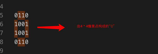 下面是我的某位大佬同學幫我解釋的,剛才我們說了每個位圖元素實際上一個純色的像素點。現在假設我們需要在一個css大小為4px * 4px,dpr為1普通屏幕上繪制一個數字“0”,那么我們繪制的樣子應該如下圖,其中1代表黑色像素點,0代表白色像素點。