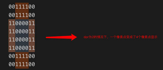 從上面的圖可以看出,在同樣大小的邏輯像素下,高清屏所具有的物理像素更多。普通屏幕下,1個邏輯像素對應1個物理像素,而在dpr = 2的高清屏幕下,1個邏輯像素由4個物理像素組成。這也是為什么高清屏更加細膩的原因。