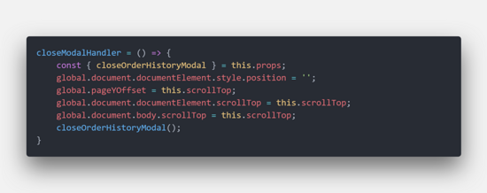 closeModalHandler = () => { const { closeOrderHistoryModal } = this.props; global.document.documentElement.style.position = ''; global.pageYOffset = this.scrollTop; global.document.documentElement.scrollTop = this.scrollTop; global.document.body.scrollTop = this.scrollTop; closeOrderHistoryModal();}