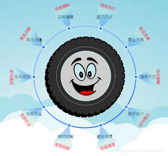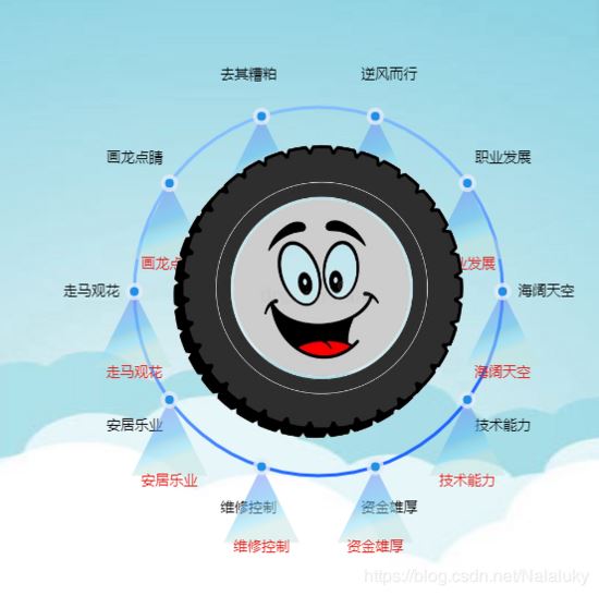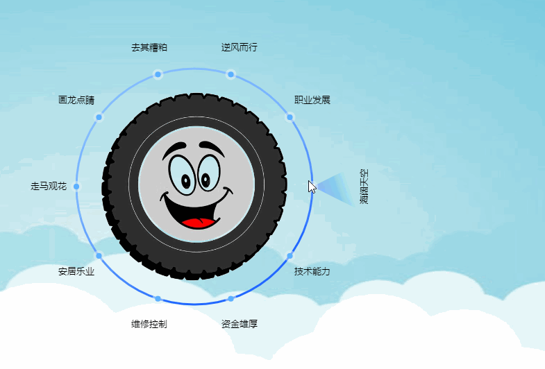 最近筆者有個需求,需求內容為:一組文字顯示在圓環的周圍,用戶可添加文字,文字圍繞著圓環,每個詞對應圓環周圍的的藍色小圓點,當用戶鼠標放在圓環上方小藍點時時,實現放射出三角形,再顯示出文字,先看看動圖效果吧!