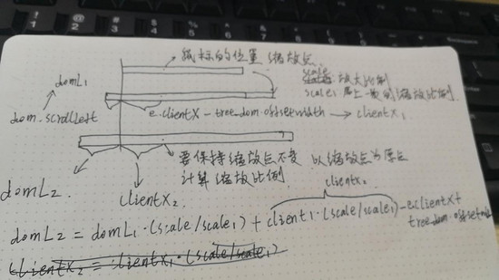 // 上圖解釋// dom = 時序圖的dom元素// domL1, domeL2 = dom.scrollLeft;// domeL1表示前一次的dom.scrollLeft;// domeL2表示當前的dom.scrollLeft;// scale 表示當前的放大的比例// scale1 表示上一次的放大比例// tree_dom.offsetWidth表示左側樹的寬度// clientX1 表示上一次的鼠標位置距離時序圖左側的距離 = e.clientX - tree_dom.offsetWidth// clientX2 表示當前鼠標位置距離時序圖的距離// 以鼠標為中心的縮放,公式為:domL2 = domeL1(scale/scale1) + clientX1(scale/scale1) - e.clientX + tree_dom.offsetWidth// 公式講解:// 1. scale/scale1表示本次的縮放比例除以上一次的縮放比例,表示當前的縮放比例// 左側卷去的寬度在第二次縮放時也會跟著縮放,所以左側的寬度需要乘以縮放比例// 鼠標位置距離時序圖左側的寬度在縮放時也會跟著縮放,所以也要乘以縮放比例// 最后面減去鼠標位置距離時序圖左側的實際距離就等于縮放時左側卷去的長度// 頁面代碼time_box_parent.scrollLeft = (time_box_parent.scrollLeft + e.clientX - tree_box_dom.offsetWidth) * (scale_x / scale_x1) - e.clientX + tree_box_dom.offsetWidth;