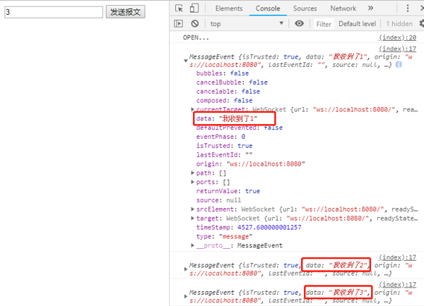 打開瀏覽器依次輸入字符1,2,3,每次輸入完點擊發(fā)送報體,可見在ws.onmessage事件中res.data中返回來我們發(fā)的報文