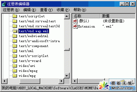 2.在HKEY_LOCAL_MACHINE/Software/CLASSES/MIME/Database/Content Type/中加入主鍵text/vnd.wap.wml,加入串值Extension,內容為.wml