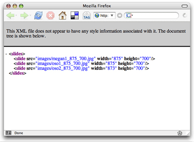 代碼很簡單。首先將內容類型設置為 xml。讓瀏覽器將該文檔識別為 xml 并為其創建文檔對象模型(dom)至關重要。代碼從 <slides> 標記開始,然后讀取圖片目錄并為遇到的每個圖片創建 <slide> 標記。最后腳本結束 <slides> 標記。