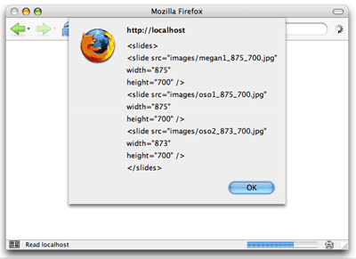 代碼從指定的 url 獲取 xml 內容,然后 loadxmldoc 函數啟動 ajax 請求。檢索頁面的請求異步發出并返回結果。請求完成后,對結果調用 processreqchange 函數。這里用 processreqchange 函數在警告窗口中顯示 responsetext 的函數值。在我的 firefox 瀏覽器中調用該頁面的結果如 圖 4 所示。
