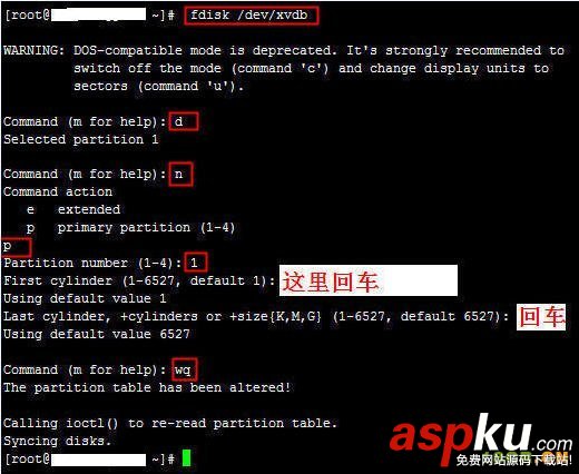 使用 fdisk 指令,輸入 d 來刪除原有的分區,然后依次輸入 n,p,1 來新建分區