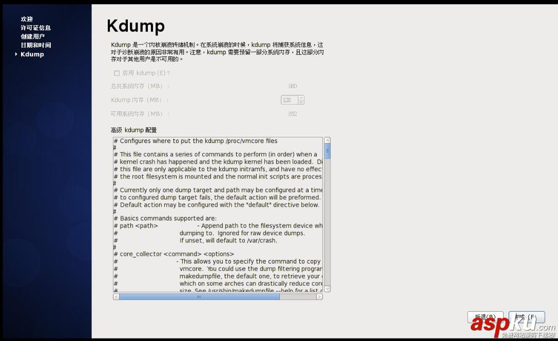 33.Kdump是當核心出現錯誤時將信息寫入檔案中,但是我們不是核心開發者,同時它所占用的硬盤空間太大,所以我們不需要它,如圖