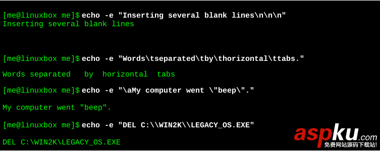 轉移字符的應用很常見。非常常見轉移字符,這個想法,首先出現(xiàn)在C語言里面。編程語言今天,shell解釋程序,C++,perl,python,awk,tcl和其他程序語言都使用了轉移字符這個概念。通過使用echo命令的-e選項,我們將展示上述轉移字符的應用: