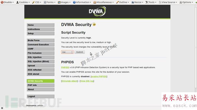 當前得到的cookie為“security=high;PHPSESSID=57p5g7f32b3ffv8l45qppudqn3″。