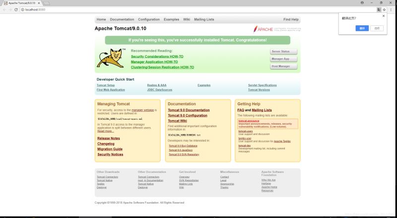 2.3 至此,tomcat安裝完成,在瀏覽器輸入“l(fā)ocalhost:8080”來測試,出現(xiàn)以下界面則表示部署成功: