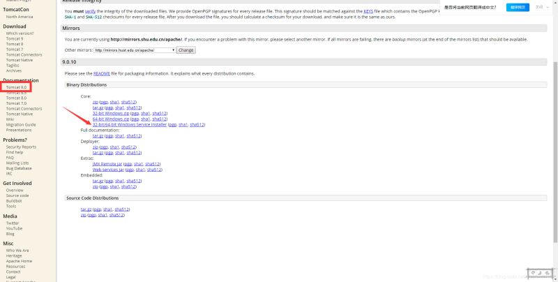 2.1 打開“https://tomcat.apache.org/download-90.cgi”網(wǎng)址進行安裝包下載,如圖:
