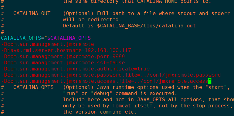 CATALINA_OPTS="$CATALINA_OPTS-Dcom.sun.management.jmxremote-Djava.rmi.server.hostname=192.168.100.117-Dcom.sun.management.jmxremote.port=9999-Dcom.sun.management.jmxremote.ssl=false-Dcom.sun.management.jmxremote.authenticate=true-Dcom.sun.management.jmxremote.password.file=../conf/jmxremote.password-Dcom.sun.management.jmxremote.access.file=../conf/jmxremote.access"